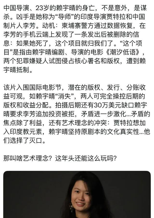 23岁中国籍女导演兼编剧赖宇晴于2025年12月30日凌晨在柬埔寨金边一处民宅坠亡线上股票配资网,案件已由当地警方以故意暴力致人死亡立案调查。