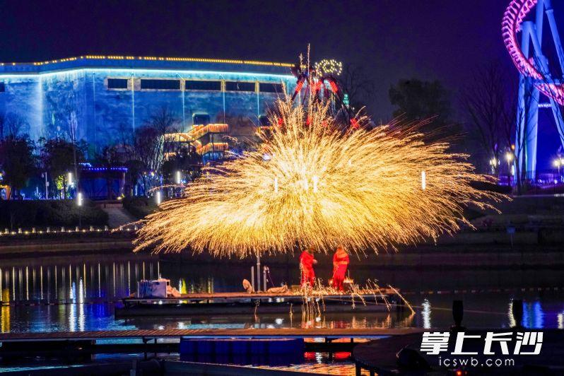 湘江海洋王国延续“海洋神马节”氛围,打造特色鱼灯巡游灯会,游客可漫步璀璨灯海,感受“鱼跃星河”的浪漫意境。夜幕降临,非遗打铁花表演成为焦点,炽热铁花如流星雨般迸溅,在湖光水色的交相辉映中,演绎千年技艺的现代活力,共度温馨团圆时光。